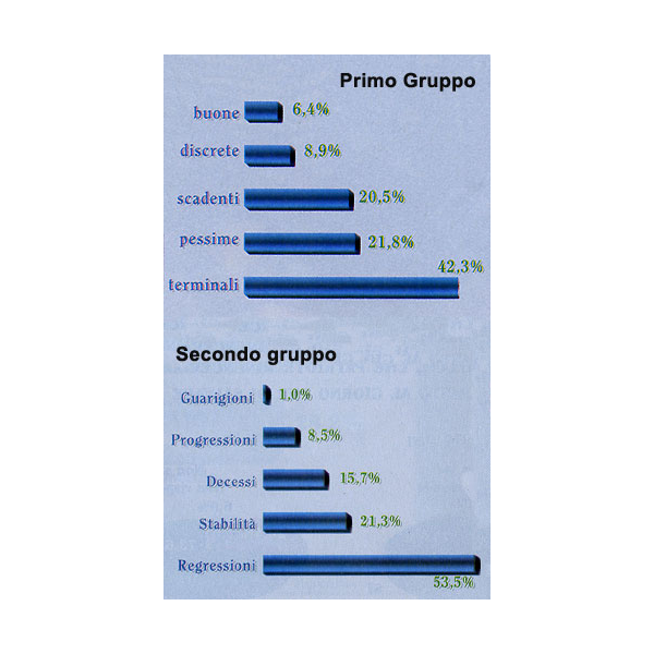 La casistica riportata nei grafici qui a fianco, comprende due gruppi di pazienti. Il primo gruppo (il 37% circa del campione) è costituito per l'84% da patologie terminali ed è stato monitorato dopo circa un anno dall'inizio della Terapia Di Bella. Il secondo gruppo (il 63% del campione) comprende, invece, pazienti terminali e non monitorati nell'arco di cinque anni dall'inizio del MDB. In questo secondo gruppo, in particolare, i decessi sono stati solo l'1,24% del totale. Nel primo gruppo, pur con una percentuale di pazienti terminali altissima, nel 41% dei casi si è registrata una regressione della neoplasia. Tutti hanno presentato un netto miglioramento della qualità della vita, mentre in nessun caso si sono registrati effetti tossici legati alla terapia. Considerando che le migliori statistiche oncologiche sui tumori riportano una sopravvivenza a cinque anni del 29% associando chemio e radioterapia, il risultato del MDB sembra innegabile: la percentuale di efficacia si aggira intorno al 47%. La statistica è stata compilata sulla base di cartelle cliniche complete di esami ematohimici e strumentali.